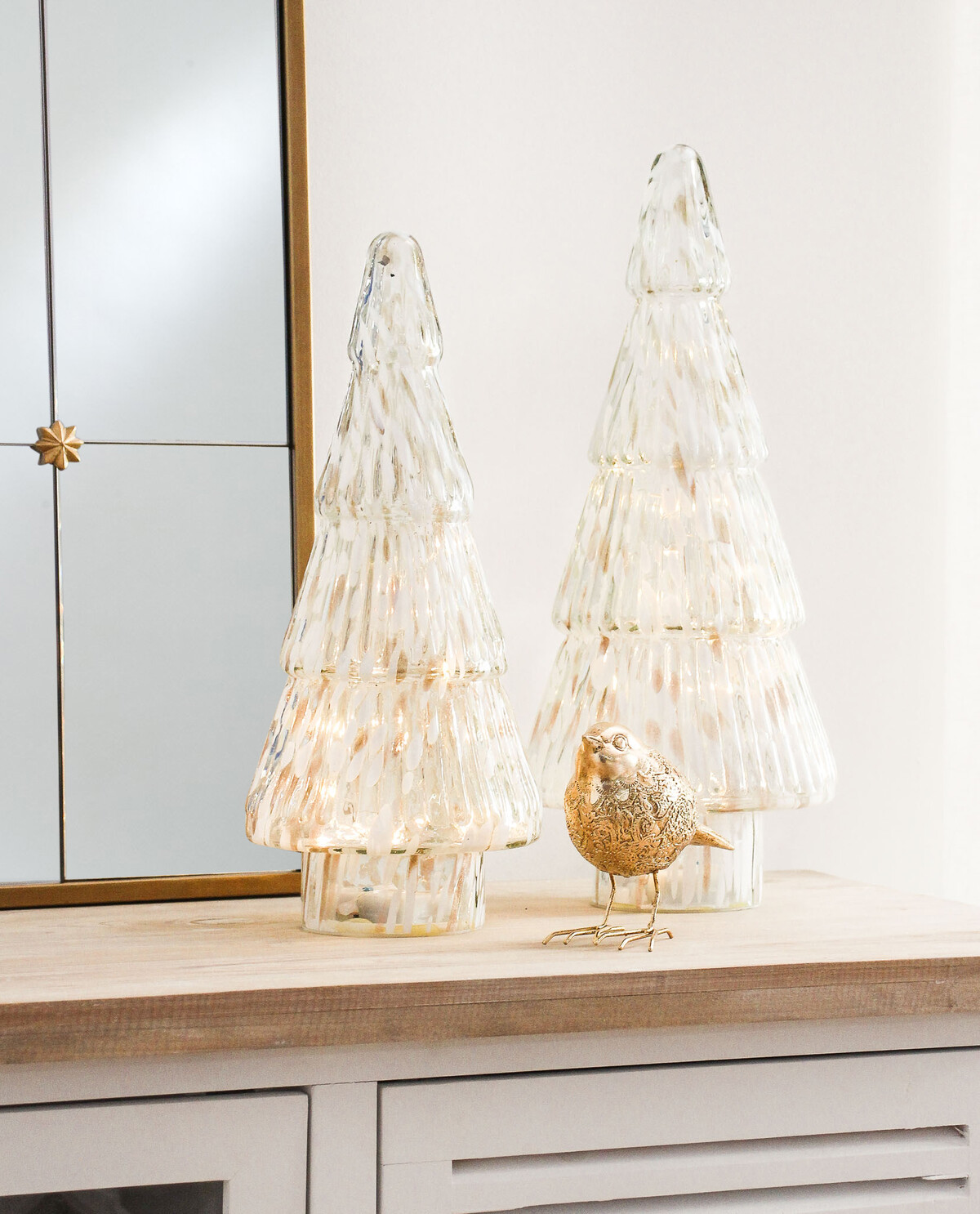 Because each one is hand crafted from glass, expect a bit of natural variation in the finish. That’s all part of the charm, though - each piece has its own personality and it’s noticeable even when displayed in bulk as a forest. They complement other metallics or natural greenery beautifully and would pair quite well with our gold or white candle holders for a full collection buy-in.
