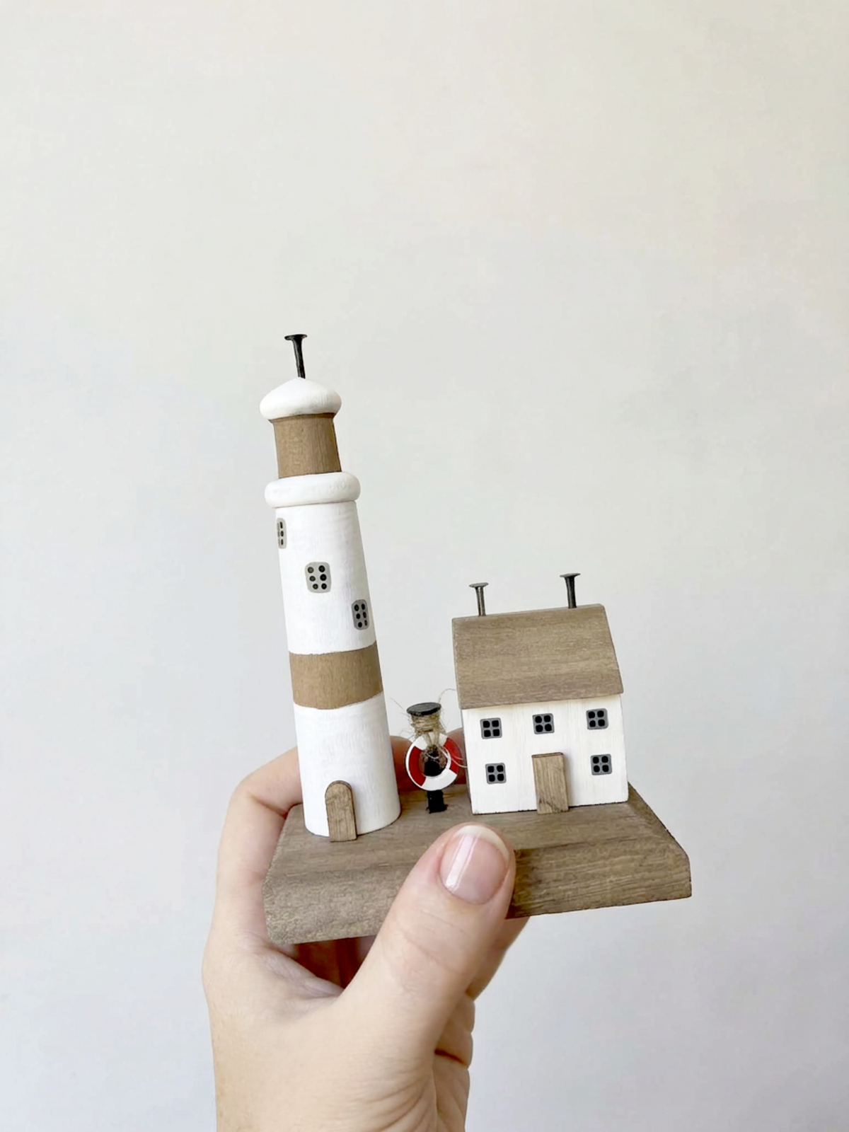 Nothing does nautical like this one. This Lighthouse Village Buoy is a proper catch - part miniature sculpture, part coastal accent, with just enough character to be endearing but never fussy or too sweet. The exposed pine wood grain is left natural in bits for balance; those areas bring out the soft hand-painted stripes and rugged black dotted windows quite nicely against all the fresh white.