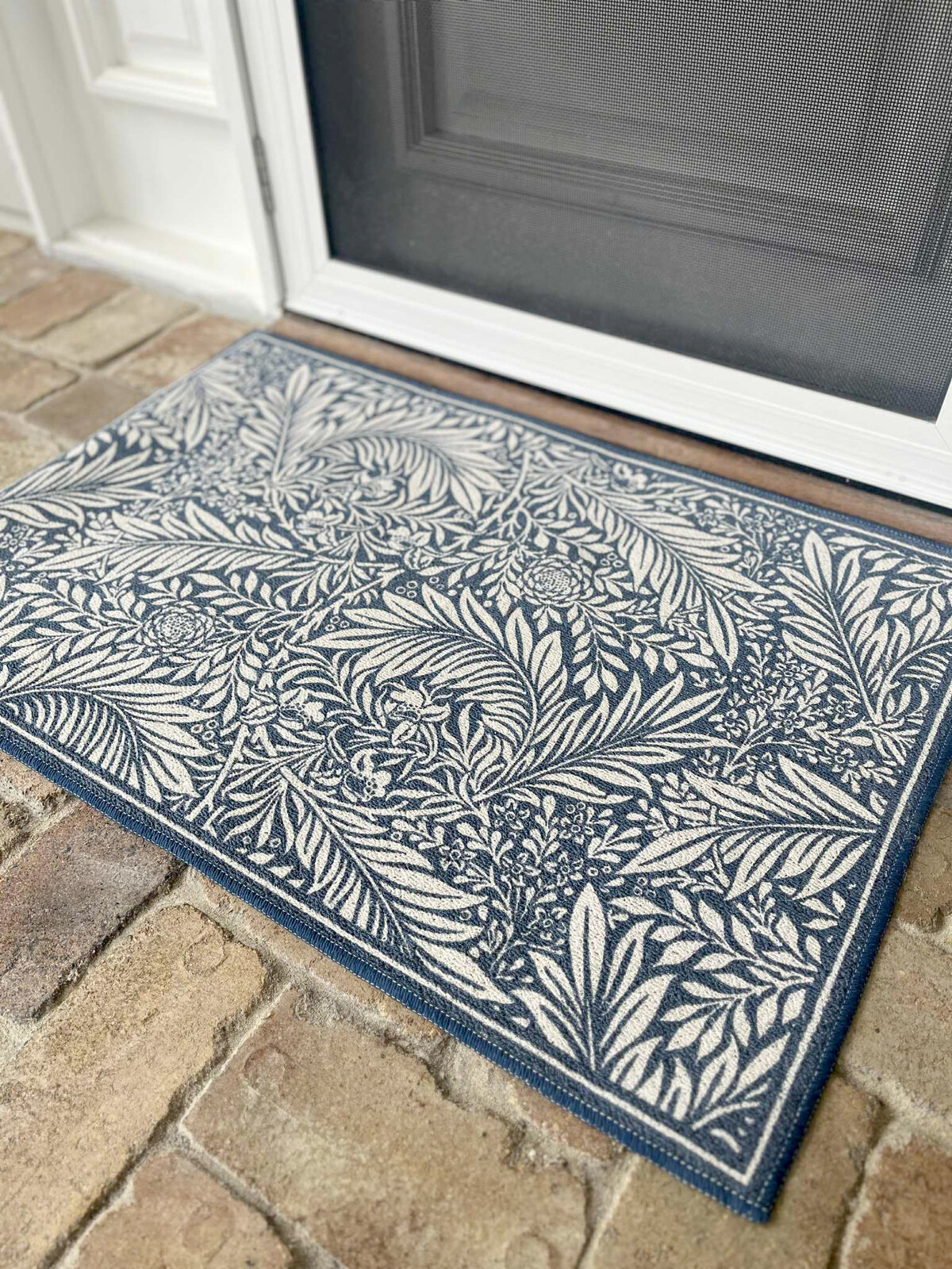 Our Mat Blue Larksspur - it’s pretty hard to walk past it without taking a second look. We’re talking about a mat that has all the decorative flair of a centrepiece with the practical sense of a floor covering, which is actually something that a lot of customers seem to want. The elegant blue and white pattern features oversized leaves and delicate florals that feel right at home in traditional, coastal and even Hamptons inspired spaces. The 60x90 cm rectangle is just right for entryways, kitchens or bedside accents, it’s not too big, not too small.