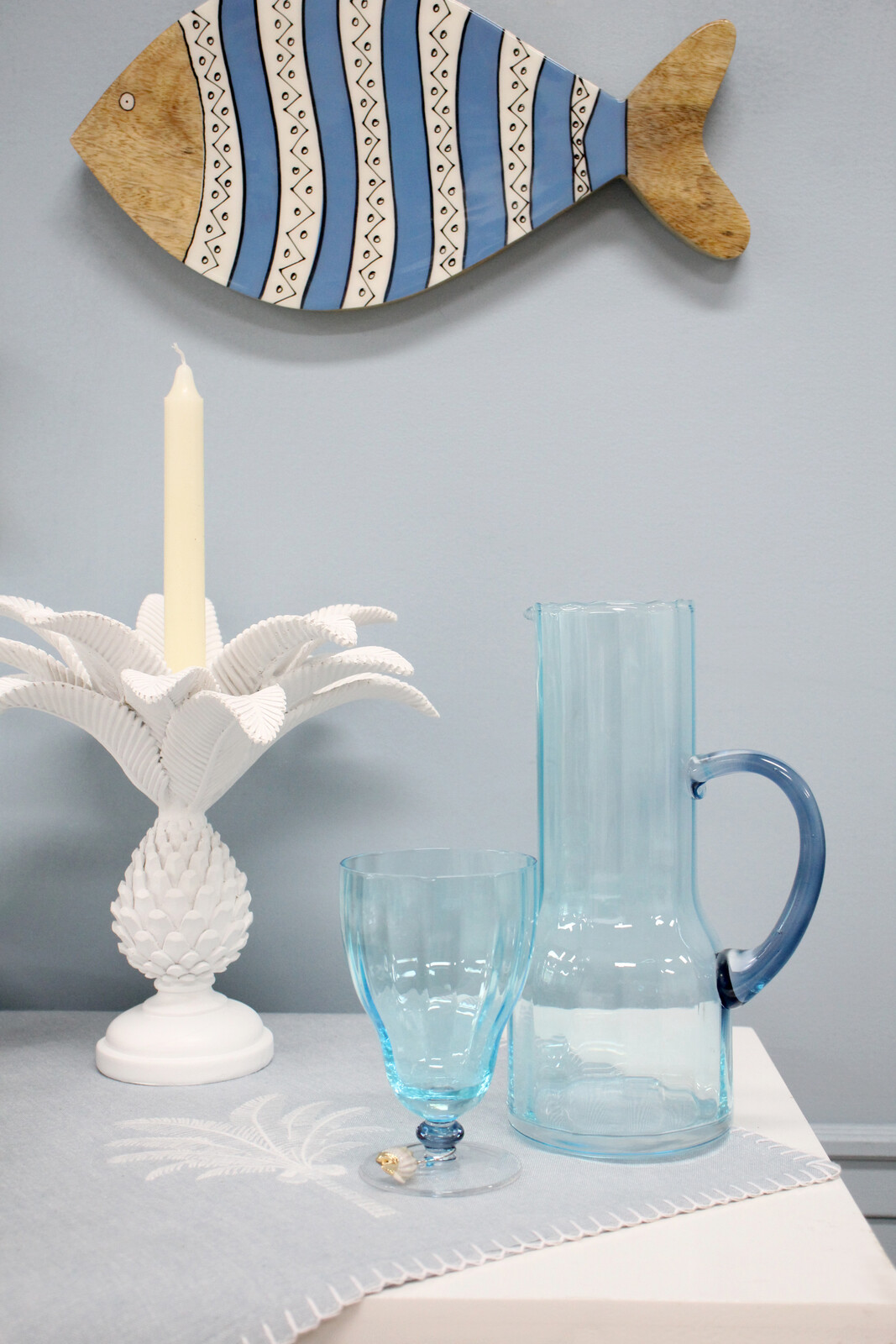 Our Ocean Water Jug isn’t just for water either. We’ve seen it work in cafes as a centrepiece for freshly squeezed juices, or in living rooms beside a vase of wildflowers. Can even see it working in boardrooms as part of an office kitchen set-up. A modern take on coastal chic and fits beautifully with other pastel or natural elements.