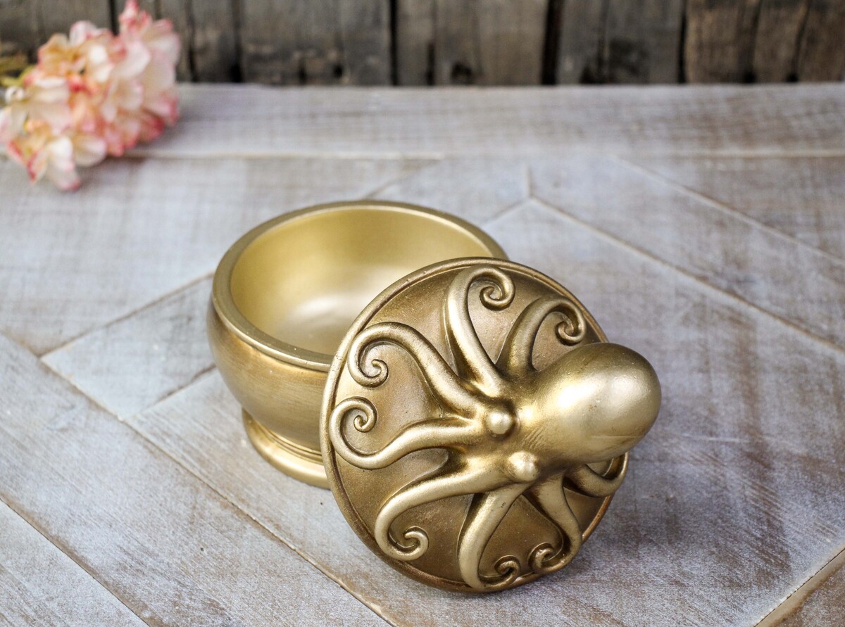 Our Octopus Box in Gold is a versatile piece too! It can double as storage for trinkets or keys and be displayed as an accent piece; customers often keep it on their consoles or by the window to serve as a conversation starter - either way, we think this piece is worth showing off!