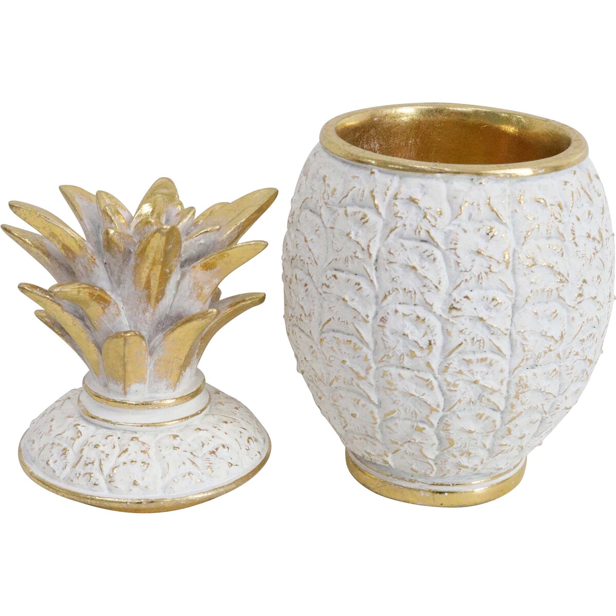 Honestly, we find this Pineapple Box one of those fascinating pieces that instantly adds personality to any shelf or table. It's not your regular trinket box - at 11x11x20.5cm, it's just the right size for keeping precious things hidden away or even presenting as a stand-alone decorative piece. The white and gold finish catches the light in all the right ways, and we love how every box feels unique because, let's be honest, perfection is a bit overrated. Each one is hand-finished with slight variations in colour and texture.