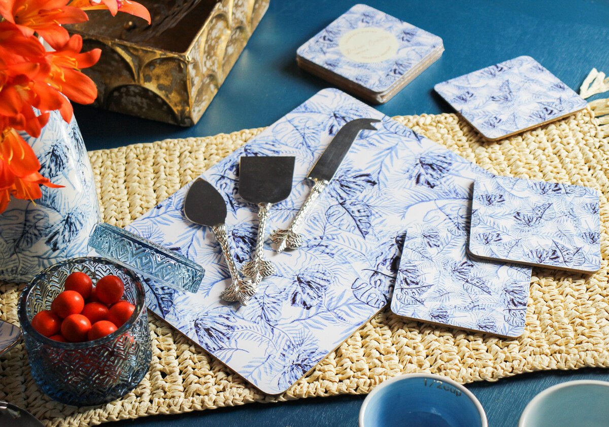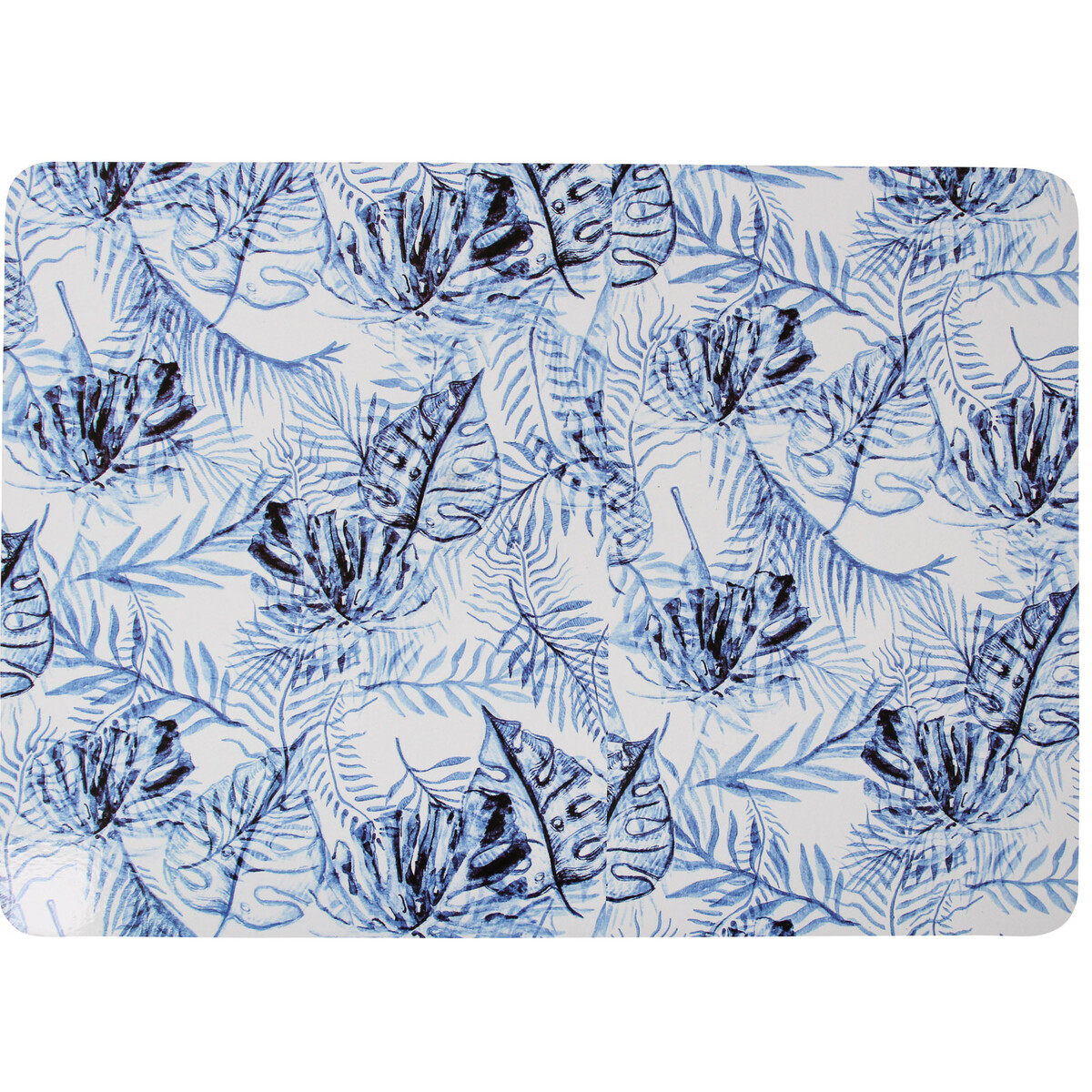 These come in a set of four and they’re just so easy to slot into any range. They’ve got a bit of a coastal feeling with the blue and white tones but, with all that tropical fern, palm, and monstera leaf detailing, they also have an almost rainforesty or exotic jungle effect. I think that’s why we keep coming back to these - it’s about the layers of patterns and blue-on-blue depth. They’re 30x21.5x0.4cm which is just right for a standard placemat - not too big or unwieldy but still large enough for plates and cutlery without stuff hanging off the edges. These feel very sturdy as well, made from a thick MDF core with a cork backing underneath so they don’t slip about when people are eating at the table. It’s a timeless look, really - modern but not too bold, something to brighten up plain tables and add some visual interest. And it’s a style that works all year round - sure, blue is sometimes seen as summer only but with the darker contrast sections this works well in colder months as well. These also feel like they’d work well with lots of different decor styles; they could be dressed up for more contemporary spaces or pared back for beachy holiday homes. We can definitely see this being something customers will use everyday - easy to wipe clean with minimal maintenance - but also durable enough for summer parties and big family meals on weekends or holidays where the tables might get scuffed by kids and busy guests. And you know what else? A lot of blue dinnerware styles have been trending recently and these would fit right in next to them on the shelf while still feeling versatile enough for everyday use. And, for those wanting to go beyond home settings? These work quite nicely in offices that want something semi-professional but still fun for their communal areas or lunchrooms - we’ve had plenty of requests from teams looking for those in-between designs that aren’t all beige everything. Enduring style plus practical features means this set is likely going to fly off shelves throughout much of the year!