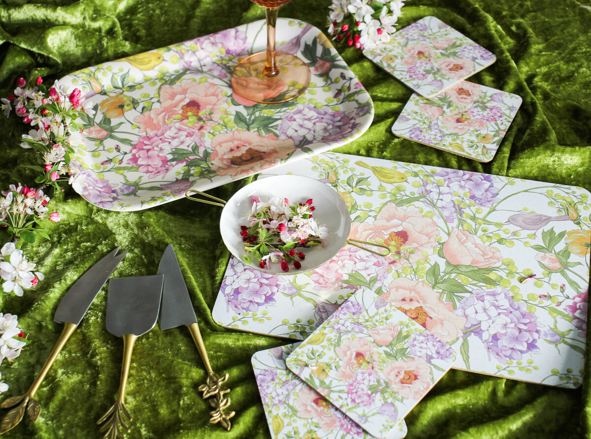 This isn’t just another placemat set with a floral print - the design’s got genuine wow-factor because of its playful twist. You get oversized blooms in pretty pinks and lavenders interspersed with lively yellow songbirds that give each piece character. And it does all this while still working alongside other settings, runners, glassware, wood grains, and linen. Never too fussy or overwhelming but always sweet. It plays well with others. Goes from gift shop to upmarket homewares boutiques to home décor sections perfectly.