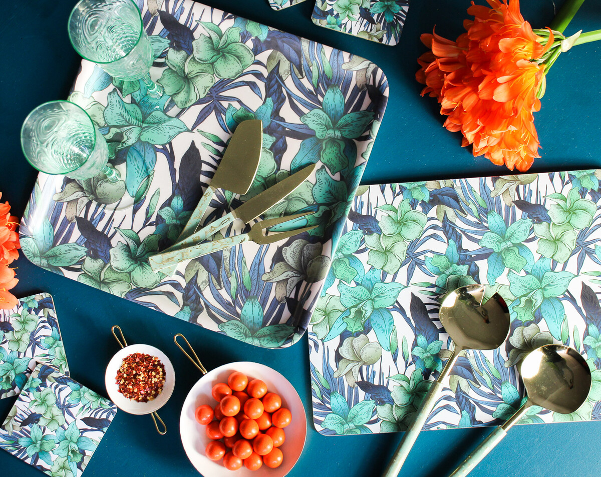 Our Placemat Set/4 Tropical Orchid Med is one of those pieces we find ourselves returning to season after season - the design is beautifully done, and the set just sort of fits in anywhere, home or office. The hand-sketched look of the lush orchids, leaves, and tropical blooms, paired with those cool blue and green hues against crisp white, feels fresh but not overdone. Each mat is 34x26.5cm - you get four per set - and the top is made from quality MDF with a real cork backing. Not just about good looks; they hold up well and have a nice weight that keeps them in place.
