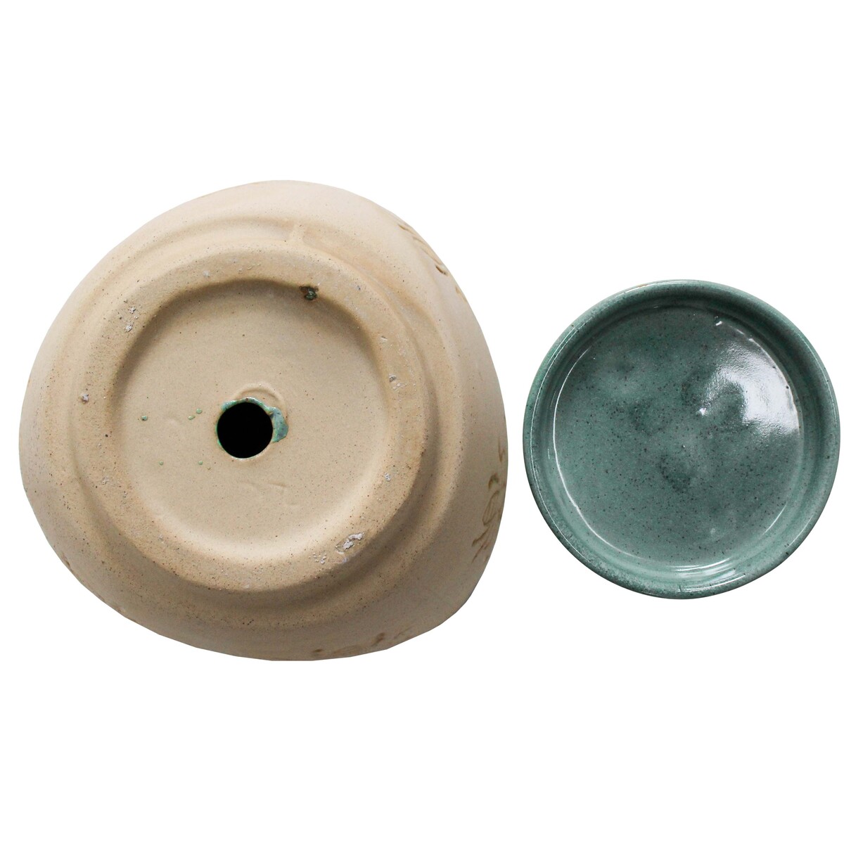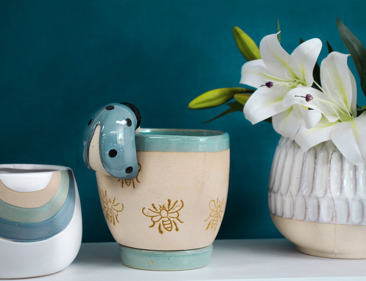 You can see the care in the details - but also how they aren’t trying to be too perfect. Each planter is hand-painted in an olive green glaze with happy bees buzzing around. The effect is calming, especially with the nature-inspired palette, but this piece still pops a bit.