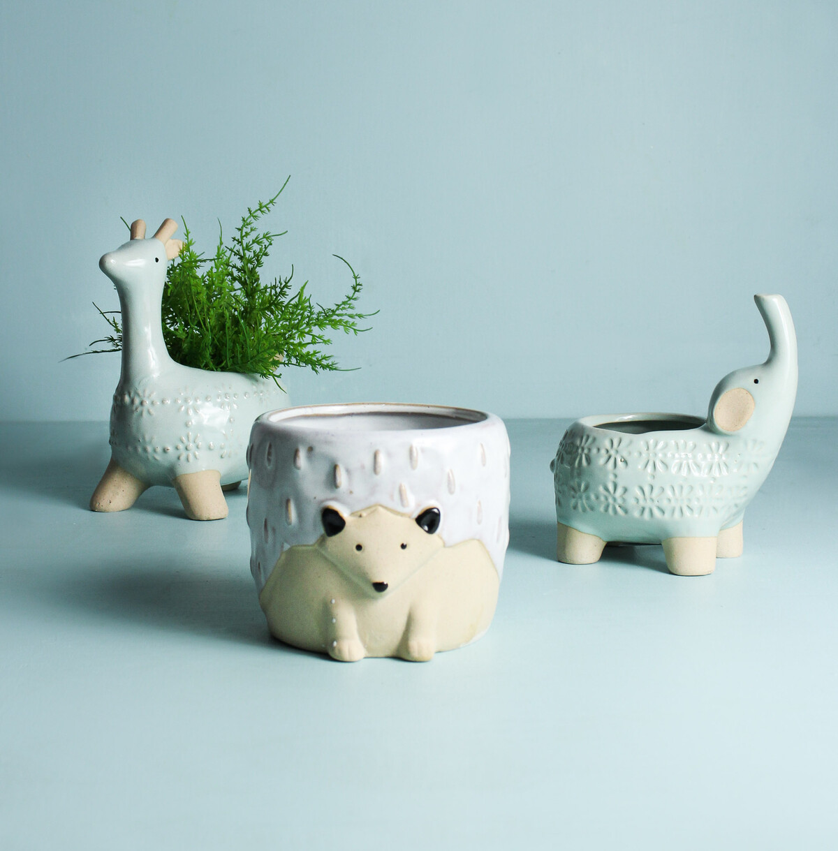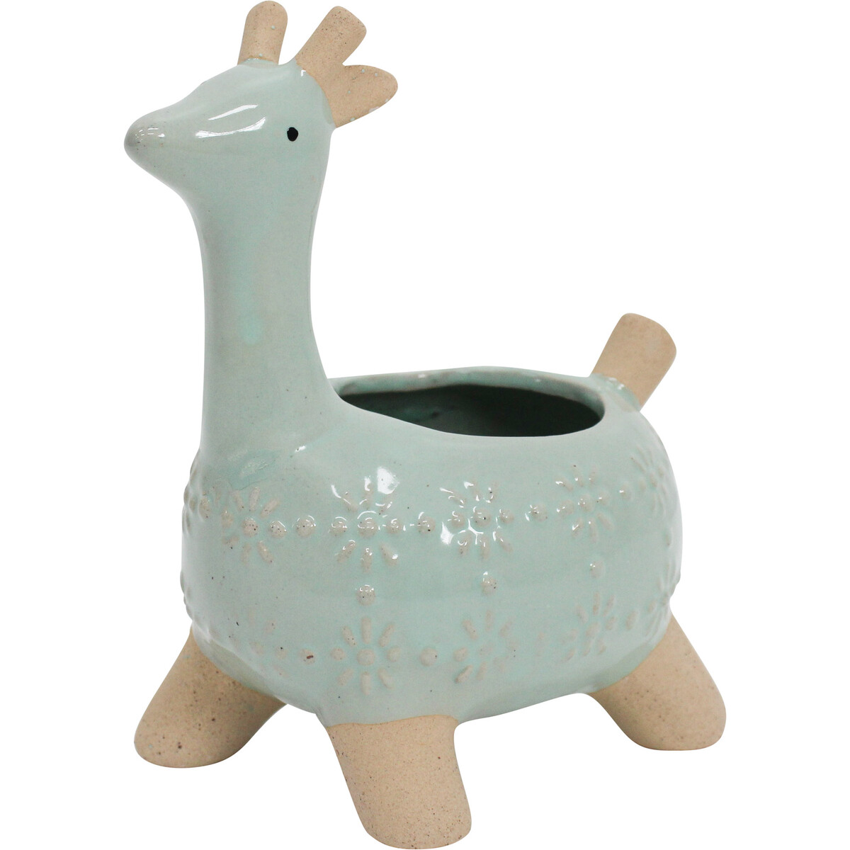 Our Planter Jaz Giraffe in Aqua is one of those pieces that just brightens up a shelf or a counter. The pale aqua blue with natural stoneware touches and subtle embossed patterns is pretty cute - but it's really the playful giraffe design that gets people smiling. Retailers who are looking for something quirky to attract attention will love this 16x9x19cm ceramic stoneware planter - it’s a definite conversation starter that works beautifully for succulents, herbs, or small flowers.