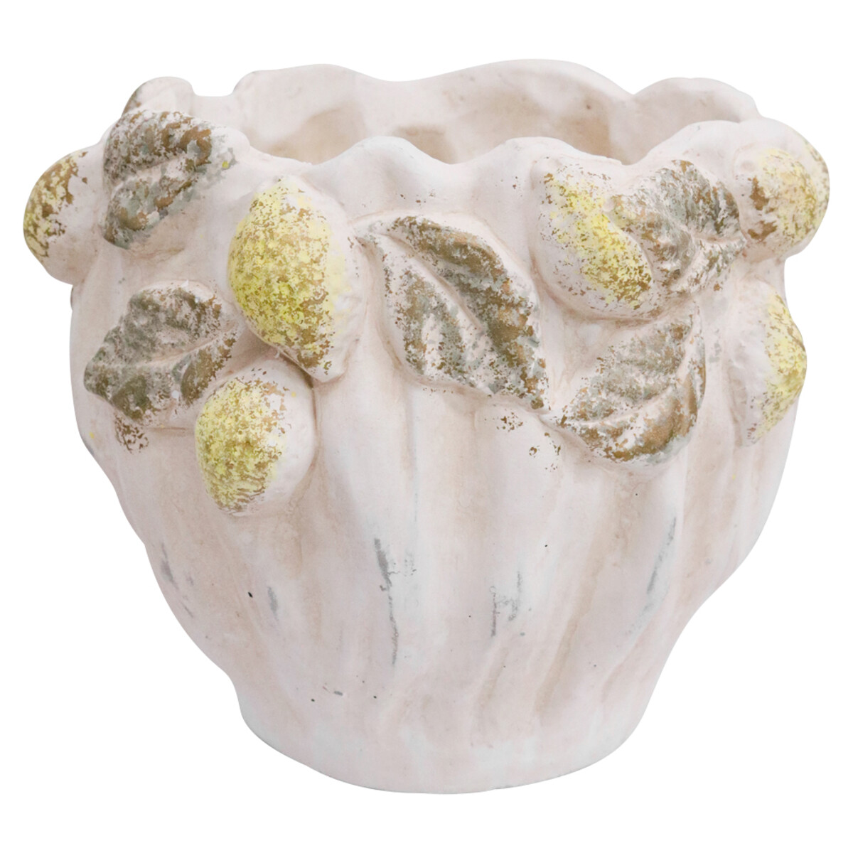 Planter Lemons Washed We do love this gorgeous Planter Lemons Washed - it’s hard not to feel as if we’re on a holiday somewhere in the Mediterranean just looking at it. Its hand-finished rustic style is a beauty and the little lemons and leaves around the rim really elevate this piece above your average pot. And, at 18x17.5x15.5cm, there’s plenty of space for your customer’s favourite plants or herbs. If your customers like their decor with a little handmade charm, we think this is worth stocking in your shop. We can picture it looking right at home on a kitchen windowsill as a herb planter, or maybe as a centrepiece on an outdoor table (we do suggest avoiding direct sun and harsh elements if you’re planning on keeping it outside though - being cement, it’ll last longer). They’re made from cement but they’ve managed to keep them lightweight so they’re easy to move about. It does come with drainage holes in the bottom, which is something your customers will appreciate in a planter - saves the faff of drilling them out themselves. This item has such unique finishes that we want to point out each planter will have its own individual markings or patches of limewash - perfectly imperfect! Imperfections are not considered faults by the makers, which is part of the beauty and nature of hand-finished items we think. These would look great grouped with some plain cement pots or placed somewhere where it can take centre stage on its own.