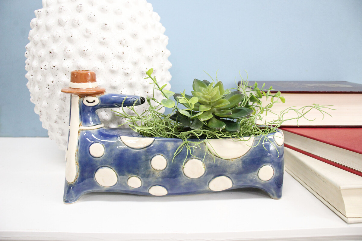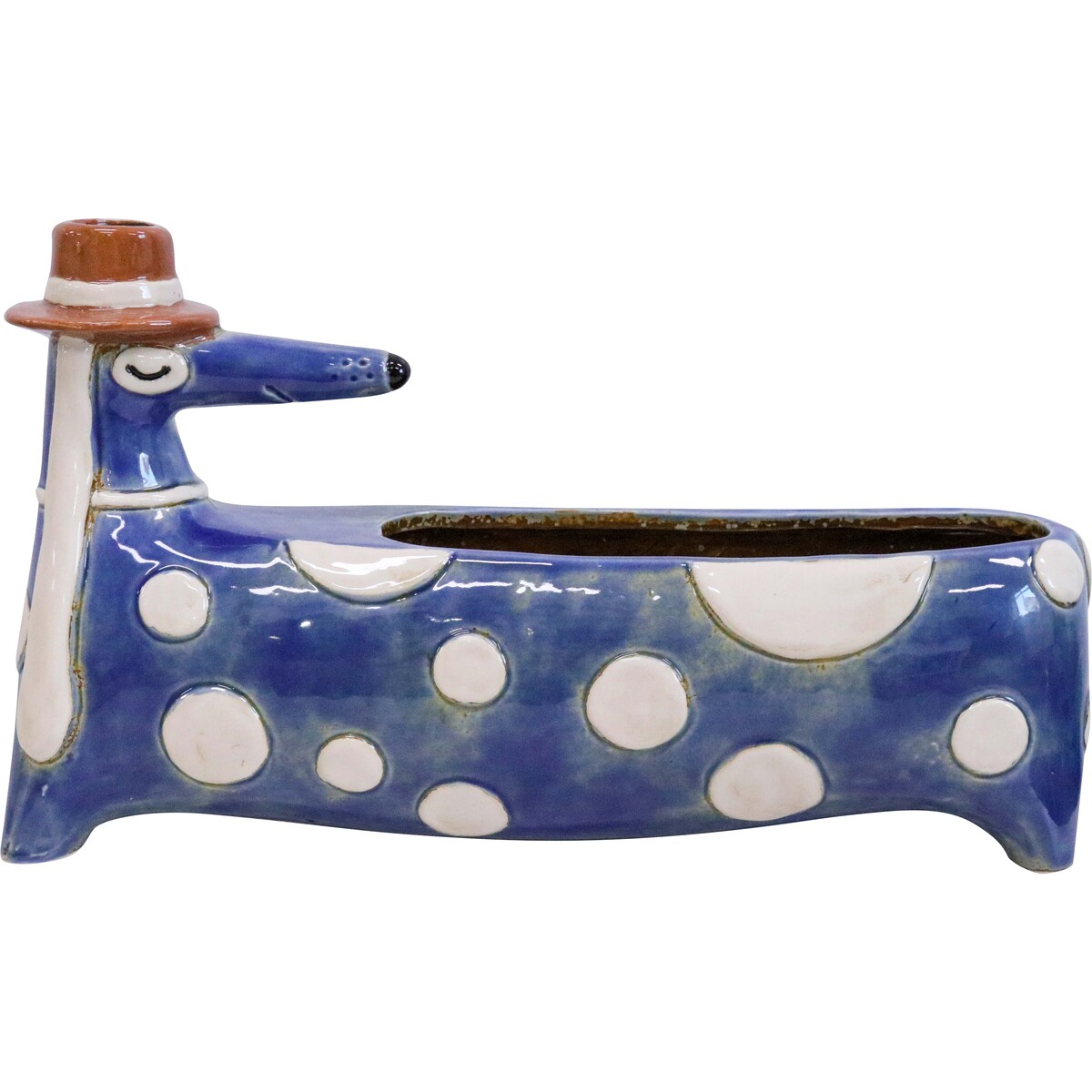 Now, here’s something that really stands out - Planter Pierre Dachshund Blu. This is one of those homeware pieces that sparks genuine reactions from customers and it always gets a comment when people walk in the room. Right off the bat, it’s crafted from ceramic, shaped into a whimsical dachshund with hand finished blue glaze and big bold white spots. There’s also an adorable hat perched on its head. The real magic is in the hand finishing, though - each planter comes with unique glaze variations. We can’t guarantee two will be exactly the same, but that’s part of why shoppers pick these up. It’s individuality done in a way that is totally intentional.