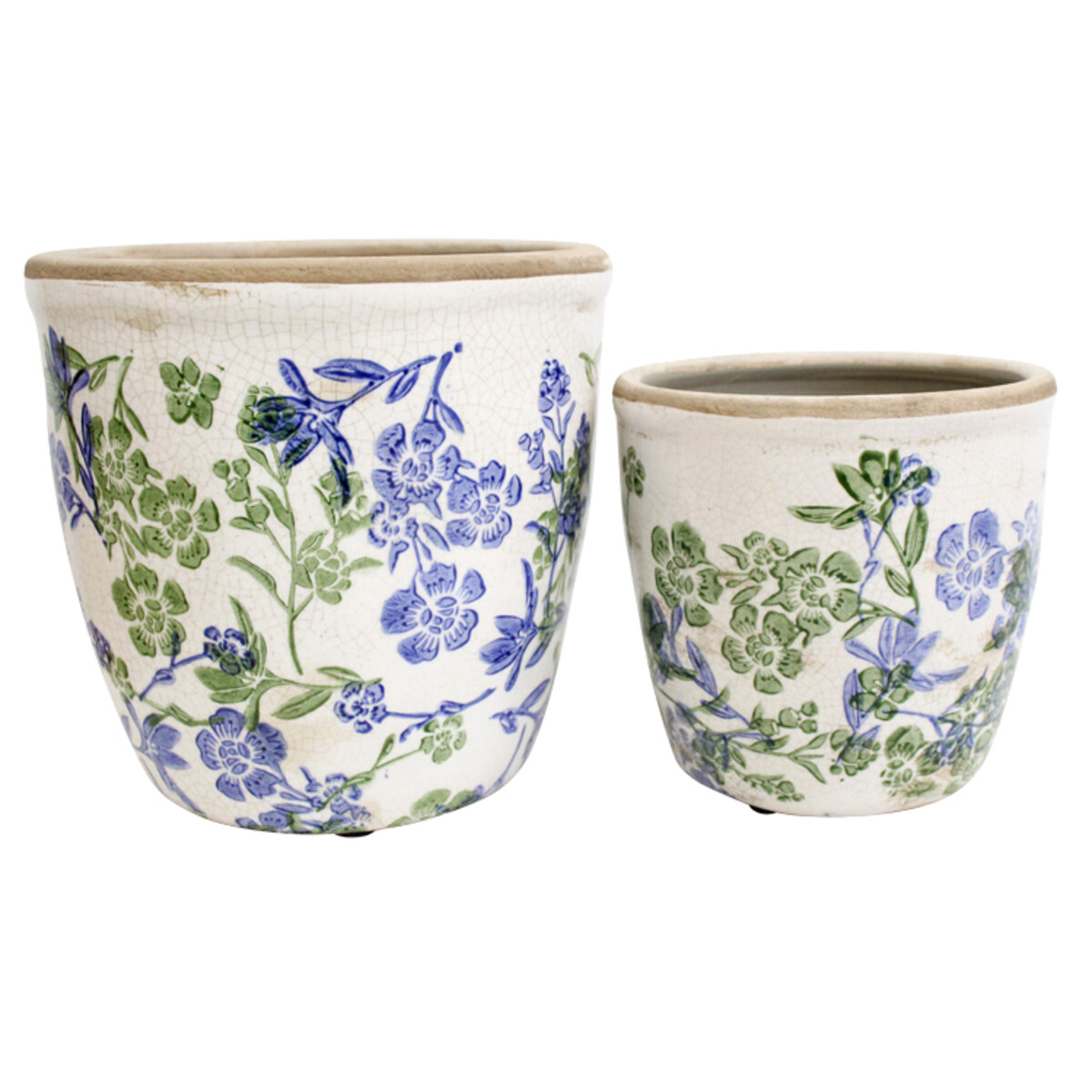 Here we have this Botanical Blue Planter Set. It’s a medium-sized set of two, both featuring gentle rustic crackle glazing and blue-and-green floral patterns that play nicely off the warm, earthy base. One is 16cm across by 15.5cm tall, the smaller is 12.5 x 12cm. They really do look beautiful together as a duo but they don’t have to be displayed as a pair - these easily stand alone too.