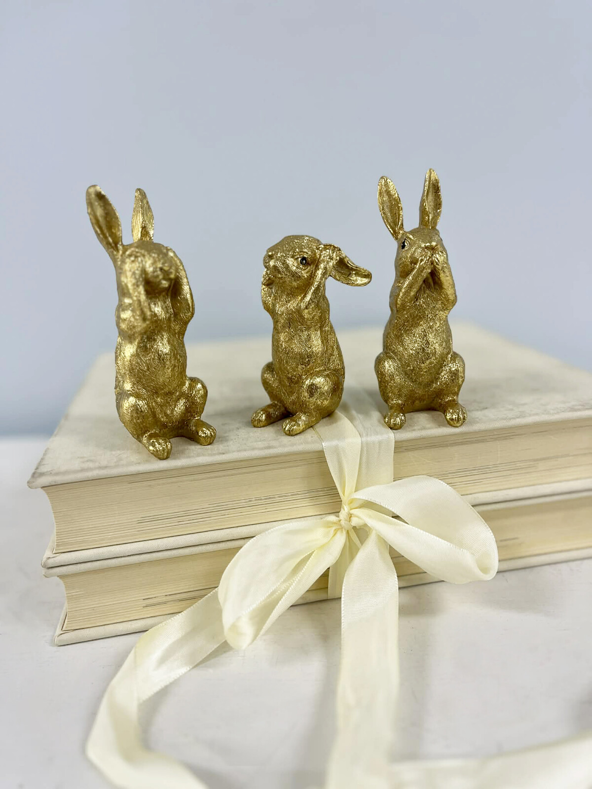 There’s a certain wisdom in these gold rabbit figurines that we keep coming back to. That phrase, “See no evil, hear no evil, speak no evil” - there’s more to it than we realise. There’s something universal about the message and that could be why these are so popular! Their metallic gold surface gives them a slightly luxurious and playful appeal, but also keeps things contemporary - and you can see their textured finish when you hold them up close. Each one is palm sized at 5.5x4.5x11cm which means they can go just about anywhere really - on an end table, as part of a bookcase arrangement or even as little whimsical reminders on your office desk.