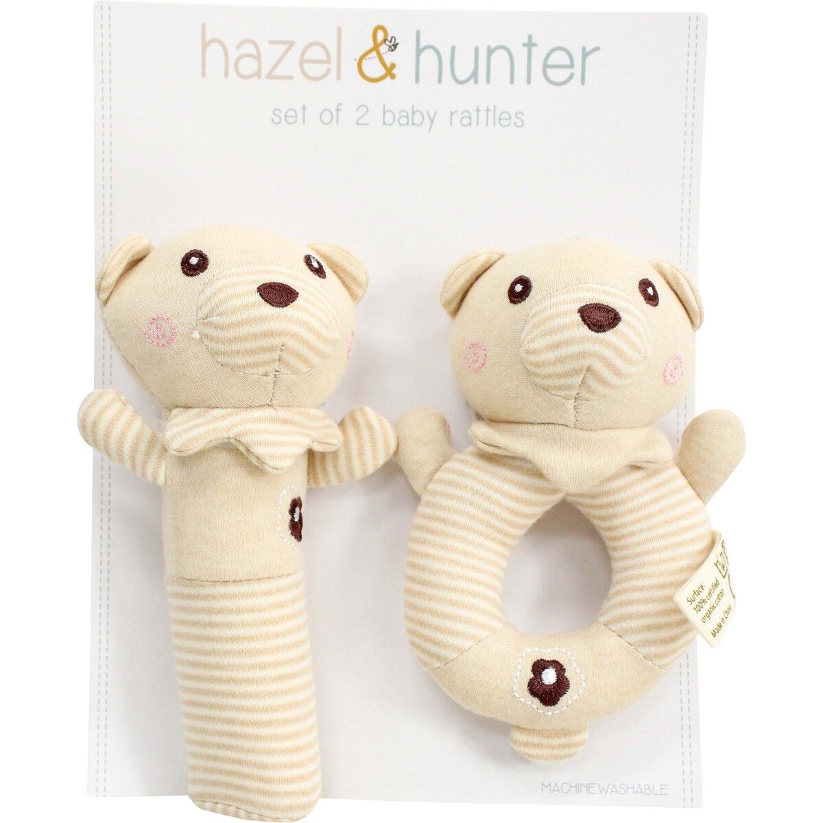 These adorable 2-pack bear rattles come in a warm, neutral tone and are crafted from polyester and plastic. They’re the perfect size for little hands - the stick rattle is 16cm long and the circle rattle is 14cm wide. Their classic design, soft material, and soothing rattle will have parents coming back for more.