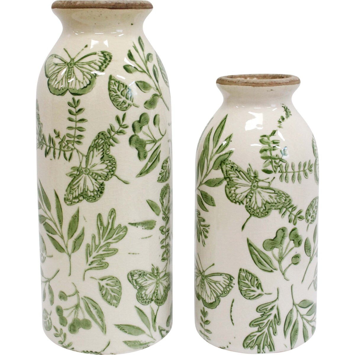 Honestly, we're genuinely excited to present this set of two Enchanted Bud Vases. They work as a beautiful addition to any homeware or giftware collection. They’re the kind of pieces that catch your eye for all the right reasons - that botanical green-on-white motif is really something. Each vase is handcrafted from ceramic and finished with a rustic glaze, giving them a real artisan charm. The subtle differences in each piece aren't flaws at all, but little reminders that every vase has been made by human hands, and that’s special.