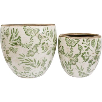 We are quite taken with this set of two planters. The S/2 Planters Enchanted is what it’s called - and, true to its name, there's something quite magical about them. It might be those whimsical green butterflies and botanical motifs or the rustic finish that's intentionally imperfect. Actually, it's probably both. These handcrafted pieces are all completely unique, not just because of the handwork but because of a deliberate, rustic finish. Some variations in tone, shape and finish should be expected and are not faults - they’re part of the overall effect.