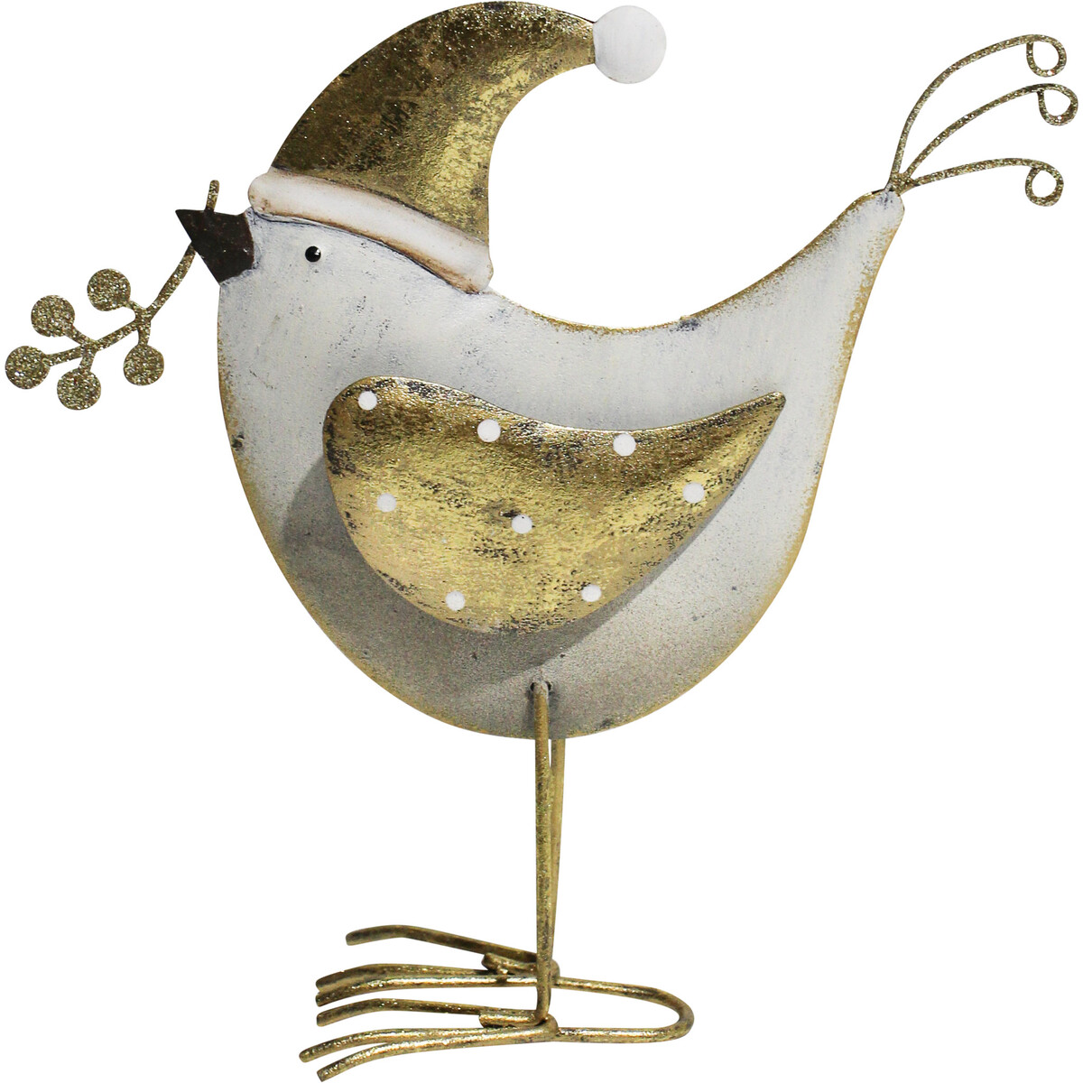 Our Santa Bird is a quirky, cheerful metal Christmas decoration that'll instantly lift your customers' spirits. It's 18.5cm tall and features a metallic gold and white design with fun dot details, Santa's hat, and a sprig of holly to bring festive flair to any home or shop display.