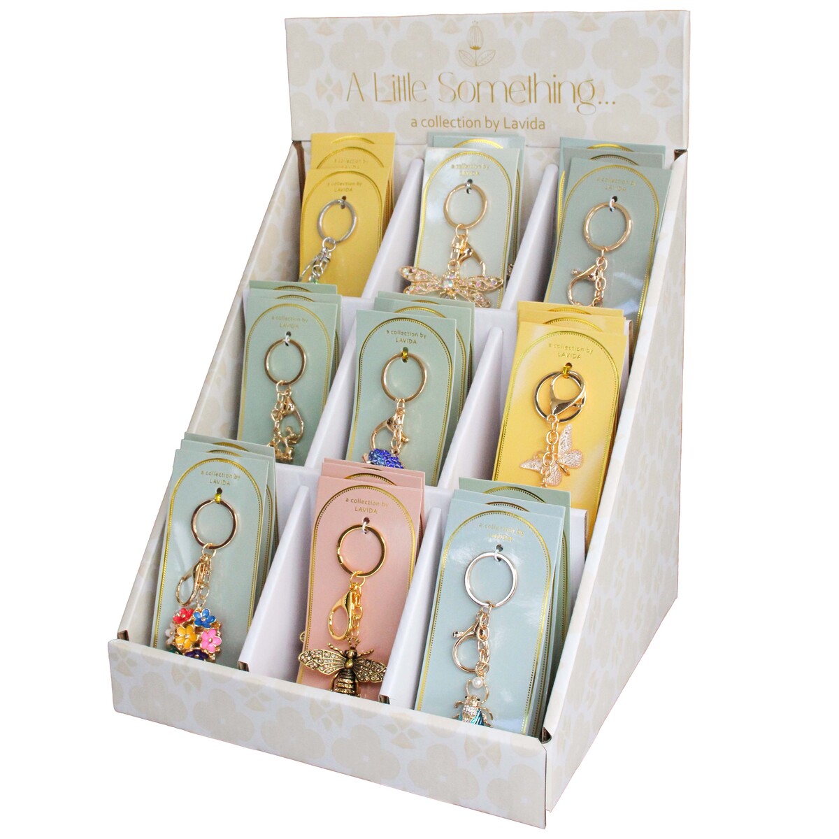 This set contains 9 different keyrings with 3 pieces of each design + display box (requires assembly).