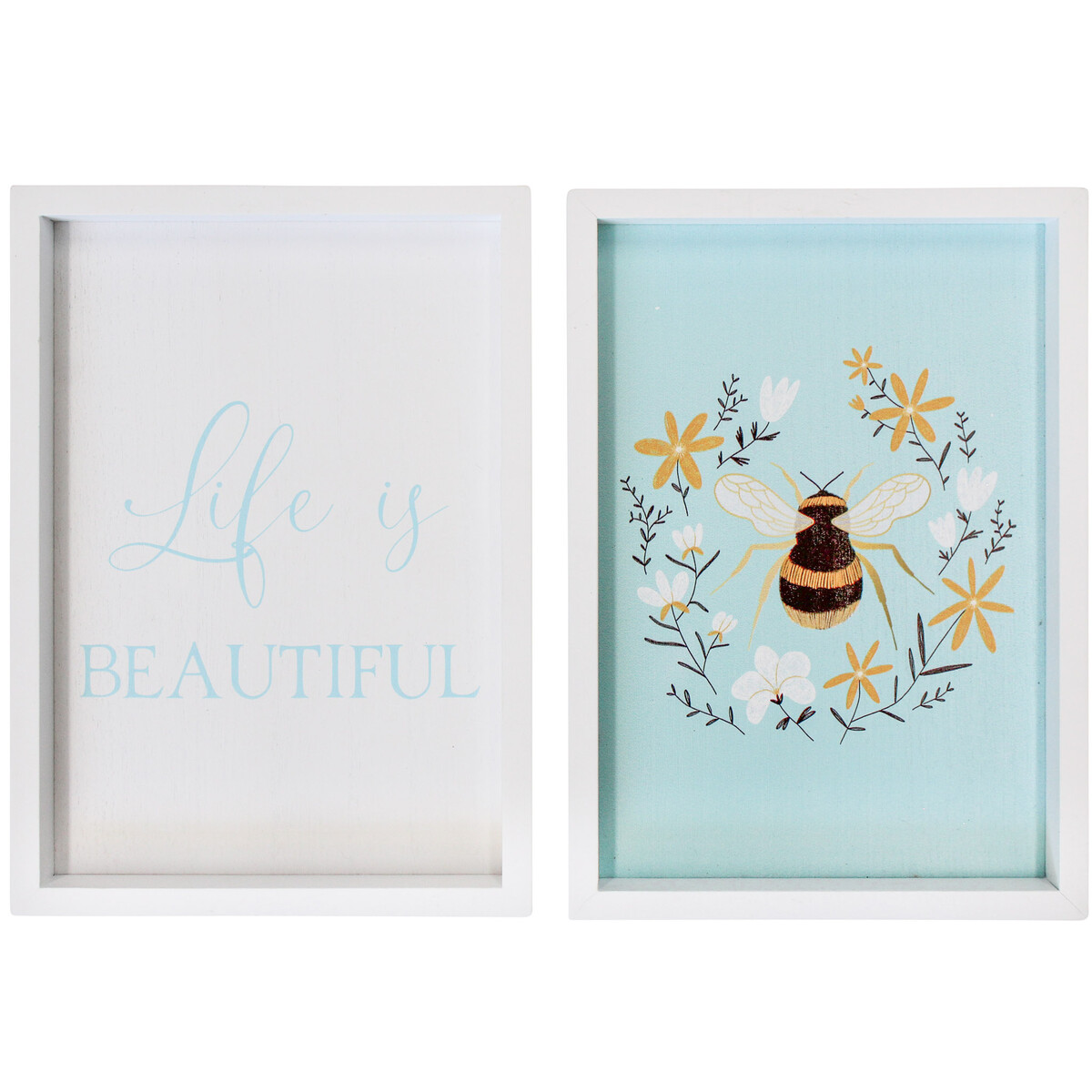 Our Sign Set of 2, 'Life Beautiful Bee', is a cheerful duo featuring a whimsical bee surrounded by flowers and an uplifting message in cool tones. Each framed piece measures 20x2x28cm and is crafted from durable MDF, making it a lovely addition to any homeware collection or gift range. We think the fresh colour palette and positive messaging will appeal to customers looking for a simple way to brighten up their space.