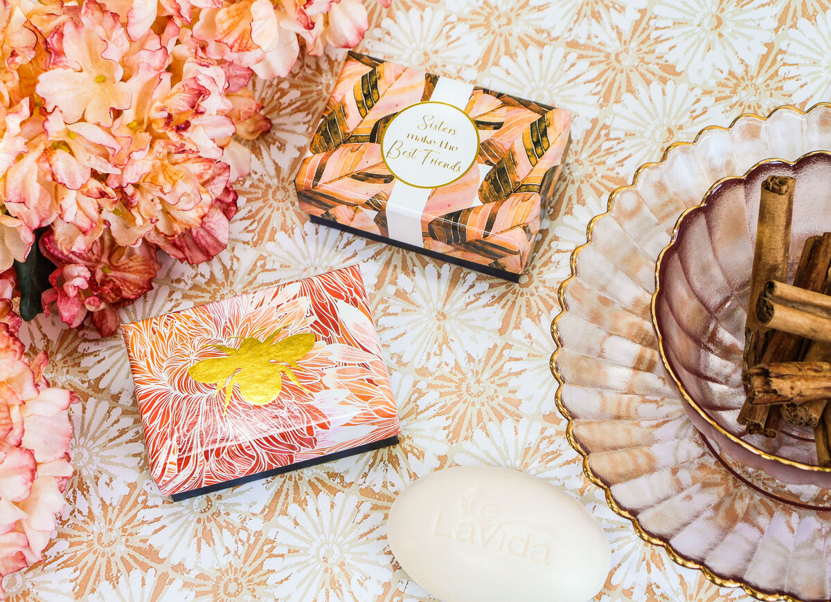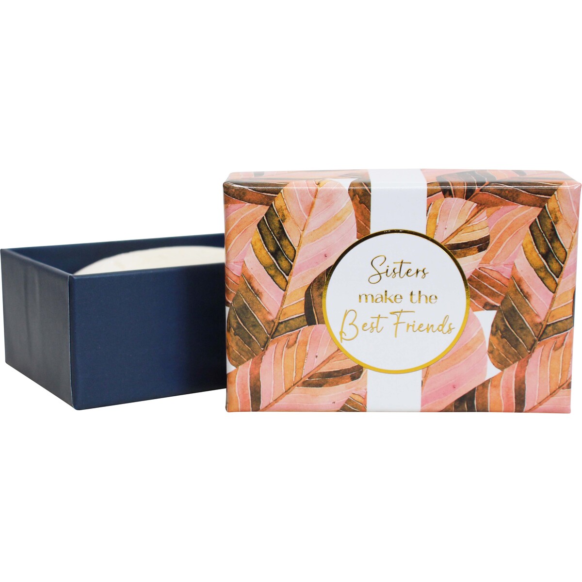This soap comes in a beautifully designed box (9x6x4cm) with warm pinks and browns, accented by gold text declaring, ‘Sisters Make the Best Friends’. We find it strikes just the right balance of being both elegant and playful - perfect for a variety of shops with different homeware styles. It has a modern aesthetic but doesn’t feel out of place in more traditional spaces either. The box contains a bar made from quality ingredients like sweet almond oil and vitamin E for gentle hydration.