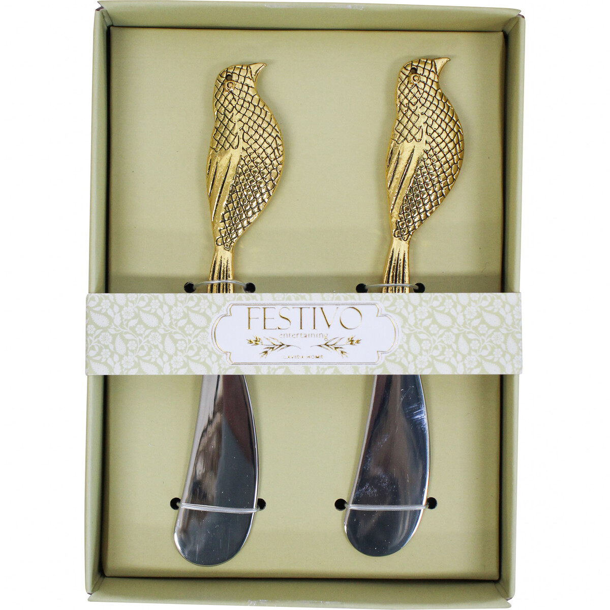 Our Festivo Spreader S/2 Bird set is one of those perfect gifting essentials - and very popular as housewarming or Christmas presents. We have been told by our retailers that these spreads literally fly off the shelves during the festive season. The spreader set features two bird handles with a rich gold finish with a metal spreader end in silver. Every piece measures 14.5X10.5X2.5CM and should be hand washed only. Our retailers have found this spreader set an essential gift item for housewarmings, weddings, birthdays, or festive gifting occasions due to its clever design, compact size, and useful functionality. As a result, many of our retailers restock these spreaders regularly in their store. We also offer some other designs such as Butterfly and Daisy, so you can put together a whole range of designs for your customers. They make great additions to grazing boards and can even be used for wine and cheese platters!