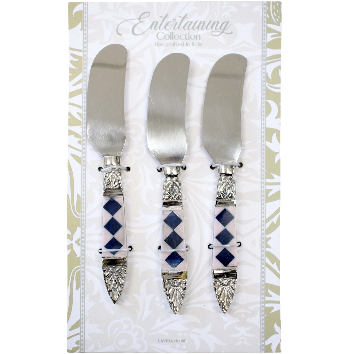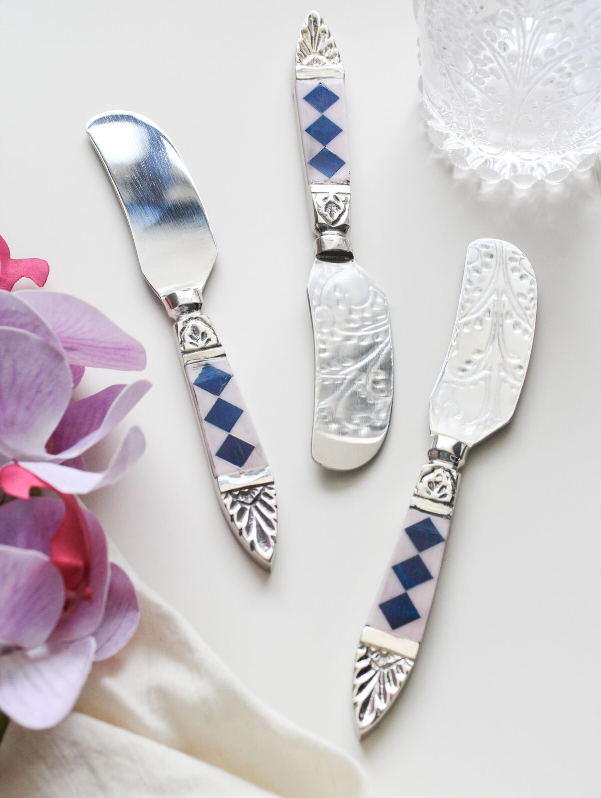 Our Spreaders Diamond S/3 are a showstopper - people love the pops of inlaid blue resin and the intricate silver tips. These cheese knives come on an elegant card for display, making them a perfect gift or addition to any dining set. Handcrafted in India, each piece measures 15.5x2x.5cm and they’re made from durable brass and resin, so they’ll last years in anyone’s cutlery drawer.