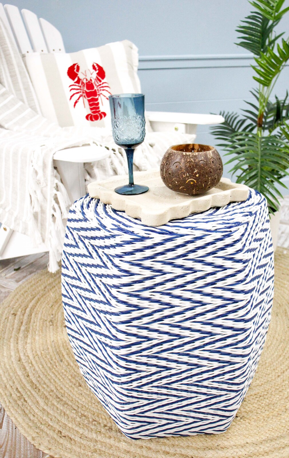 This is a fantastic piece for retailers who want to offer their customers a flexible, stylish option for home or garden. We love the Hamptons stool-table's fresh blue and white woven PE finish and that practical coated metal core - it looks just as great as extra seating as it does with a few drinks perched on top. Its 45x48cm size fits most spaces and brings some serious wow-factor to coastal, modern or contemporary spaces.