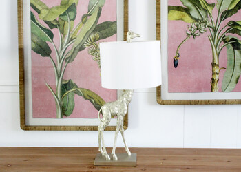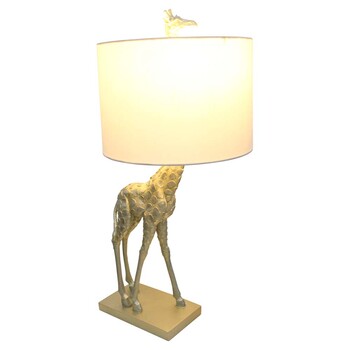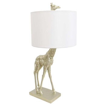 We have this really special piece - the Table Lamp Giraffe. This one’s a bit of a conversation starter in any setting. It has this sculpted base with a giraffe that stands tall, made from polyresin, and it’s topped with a soft linen shade. The neutral b'' colour blends really well, even for someone who isn’t big on bold animal motifs.