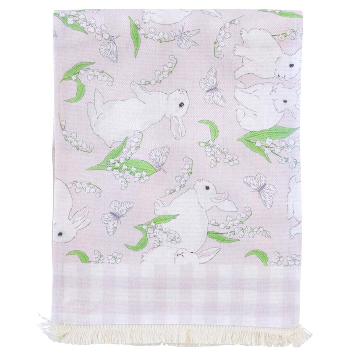 If your customers are after a soft pastel look or that classic bunny aesthetic - yes, it’s a thing right now - then this is the perfect table runner to have on display. It’s got a pretty pastel pink background, all these little white bunnies hopping around, lilies-of-the-valley, butterflies - so lovely and gentle. This one is perfect for springtime shops or even as a gender-neutral nursery decor addition. Of course, with an item like this, it’s important to keep the classic checked border and fringe at the end for that vintage feel too.