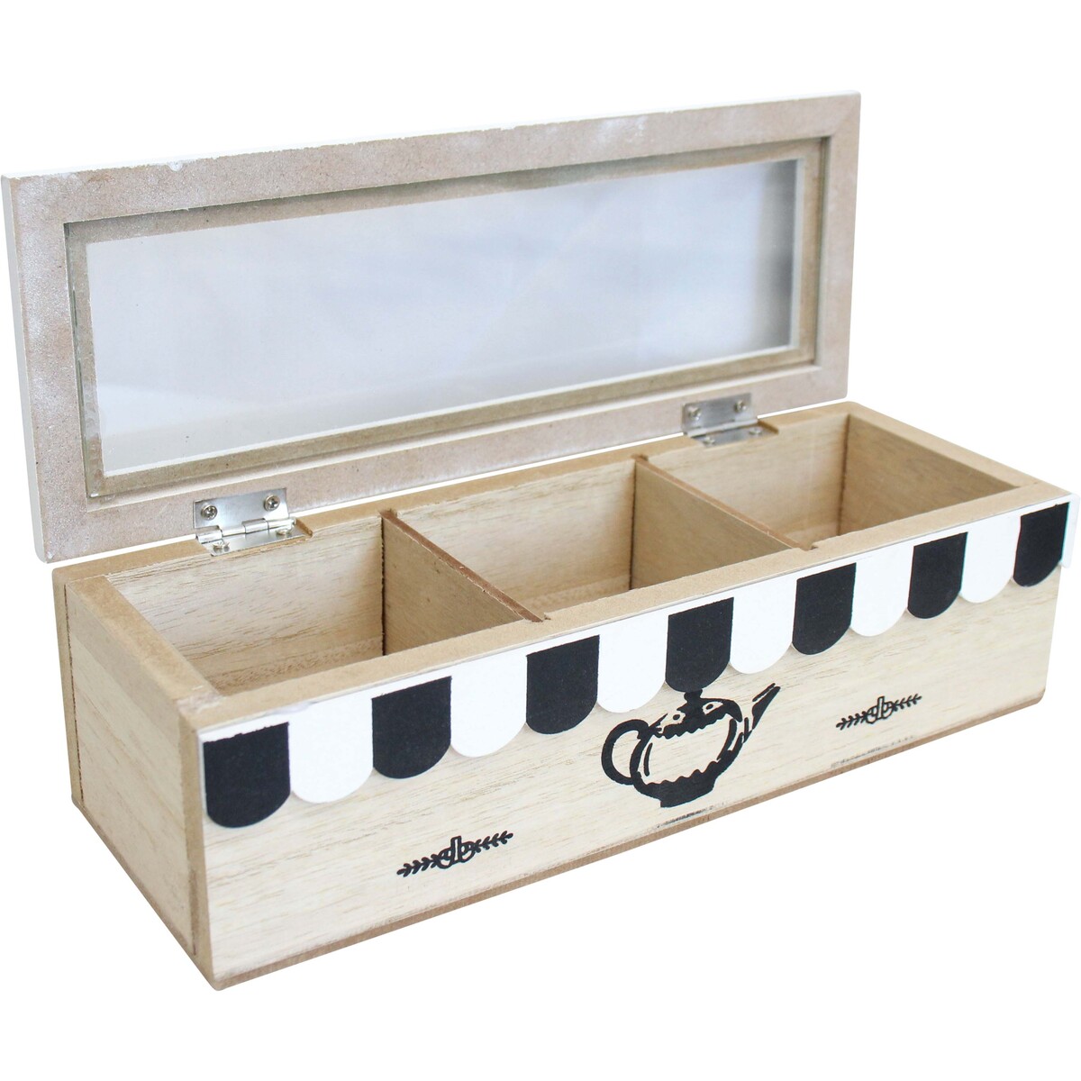 Our Tea Box Sml Cafe (24x9x7cm, MDF/Glass) is one of those simple, well-made products that always seem to strike a chord with both retailers and your customers. We’ve found this small tea box to have universal appeal – partly because the black-and-white palette suits so many decor styles, but also because it’s all about inviting people to slow down for a cuppa. A little cafe vibe, a playful nod to vintage awnings, and a clean line drawing of a teapot that keeps it feeling modern. We designed it as an easy-fit gift for home or office. Small enough to pop anywhere – in a bedside breakfast tray or on a work desk – but big enough to hold an impressive assortment of teas in three sections beneath the glass lid. The finish is crisp but natural, with neat white edges and fresh pale timber grain. Pretty, practical, and a great price point for gifting season displays.