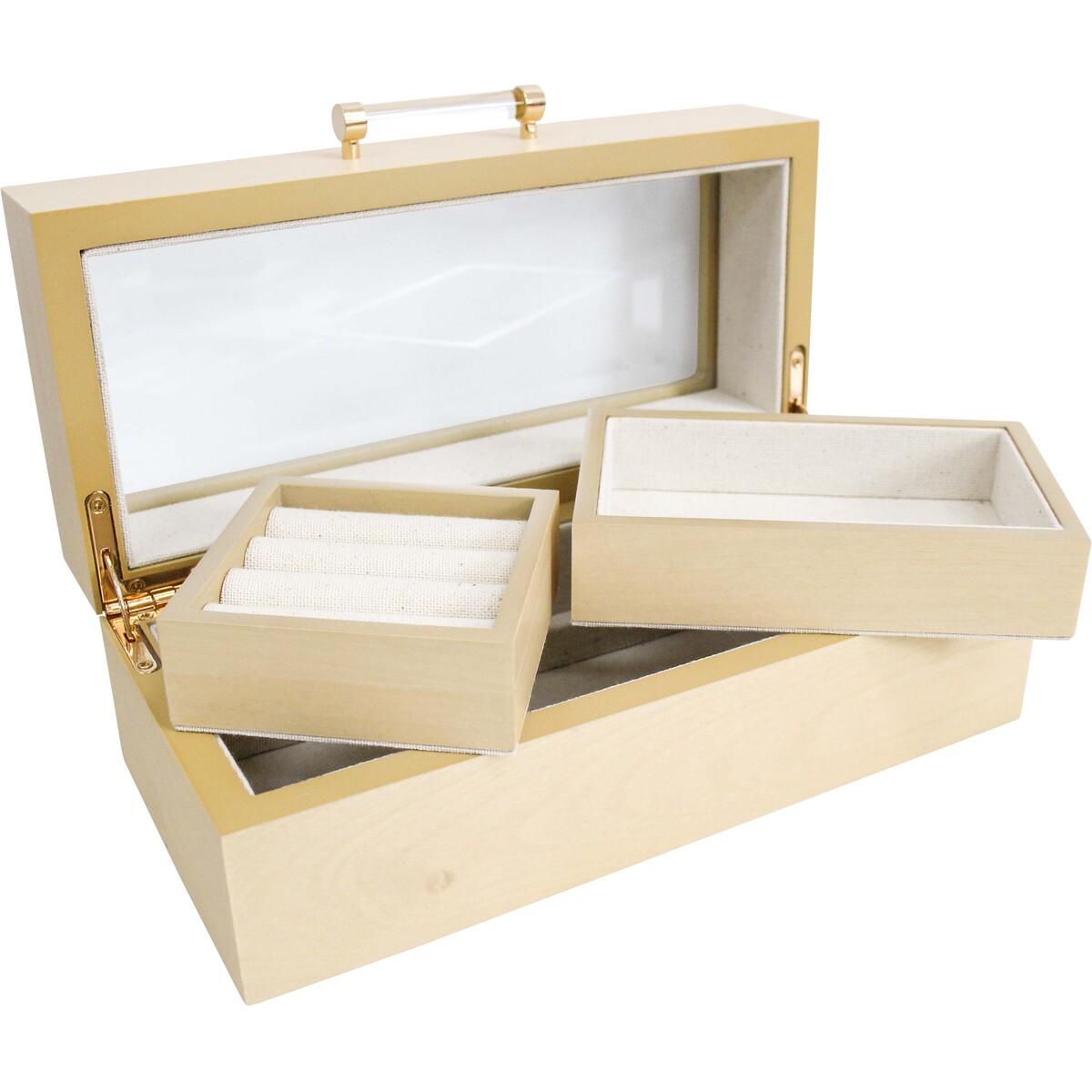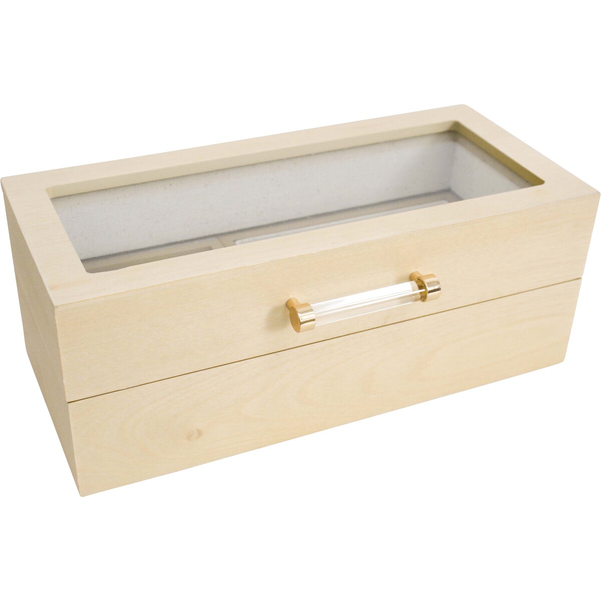 Jewellery should be the focal point, not the clutter - our Timber Low Jewellery Box in Beech makes it so easy to keep a streamlined, modern display anywhere from walk-in wardrobes to living room coffee tables or even an office desk. Compact at 22x10x8.5cm but so spacious with two removable inner trays. One of them is perfect for keeping rings and statement earrings in, while the other can fit chunky bracelets and watches with ease. So that's all your jewellery storage sorted. Not only is this convenient for your customers to stay organised but also versatile in how it fits into their homes.