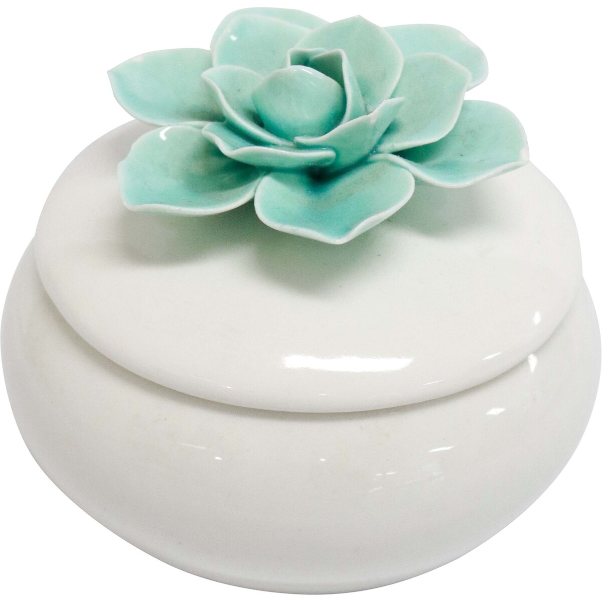 Our Trinket Jar Teal Flower is not your everyday storage piece. It’s a really lovely white ceramic jar with a pretty teal succulent on the lid - which will stand out instantly in any homewares or gift shop display. At just 8.5x8.5x7.5cm, it’s not huge or over-the-top, but big enough to keep jewellery, office supplies, little desk treats, small cosmetics, even pet treats. You name it.